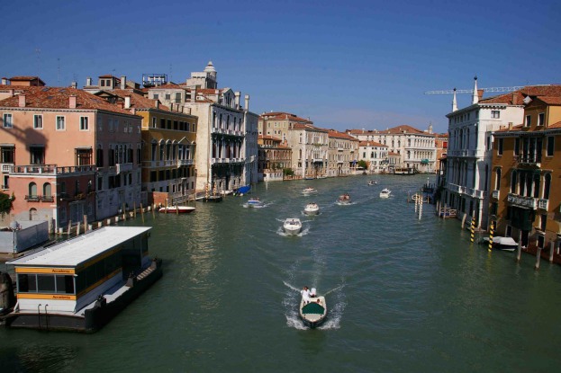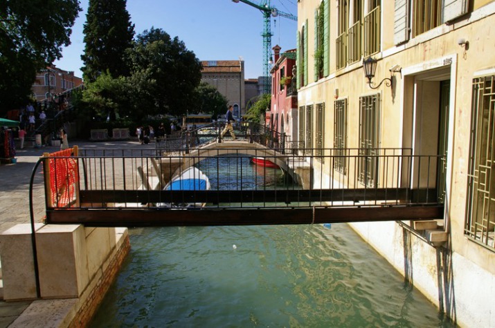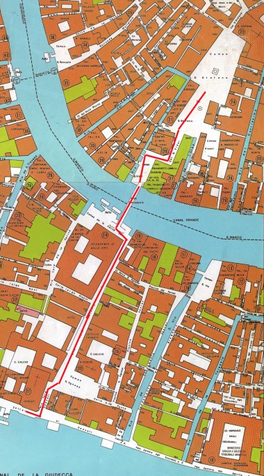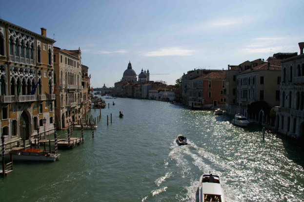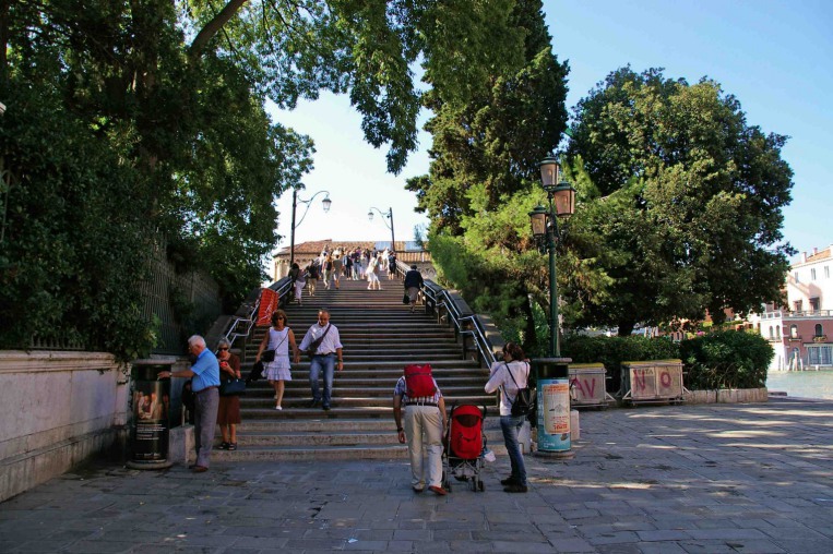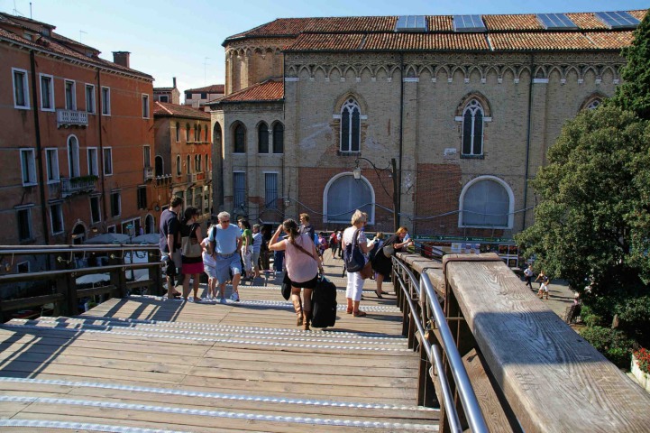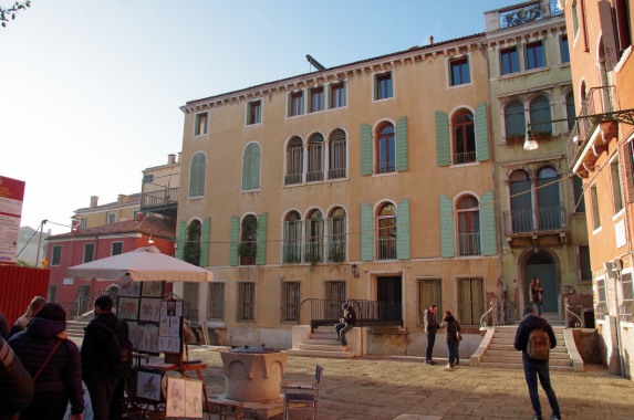 Nous quittons le Campo San Stefano en passant devant San Vidal, et à hauteur du Palazzo Franchetti tournons à droite vers le Campo San Vidal. Un petit regard sur les 4 ponts qui traversent le Rio de San Vidal et nous traversons le grand canal sur le Ponte de l'Accademia. Une petite pause sur le pont nous paraît indispensable même si il est normalement interdit de stationner sur les ponts à Venise. Angle du Rio Terà Antonio Foscarini et de la Calle Pompea