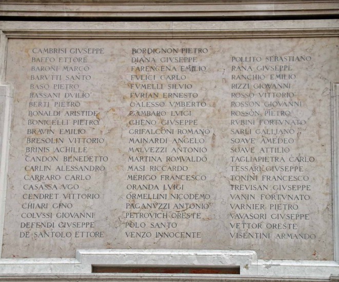 Il n'existe pas à Venise de monuments aux morts comme on peut les connaître dans les communes de France. Les victimes des guerres mondiales sont honorées dans le cadre des paroisses par des plaques apposées généralement sur un mur de l'église paroissiale.