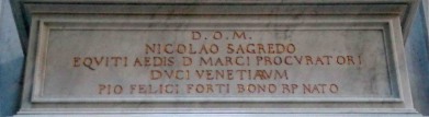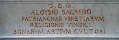 Alvise Sagredo né en Janvier 1617 dans la famille noble Sagredo, a été élu Patriarche de Venise par le Sénat vénitien, le 21 Septembre 1678. N'étant pas prêtre, il a été ordonné le 25 Septembre suivant et a pris possession de la cathédrale de San Pietro di Castello le 3 Octobre. Il resta Patriarche de Venise jusqu'à sa mort 13 Septembre 1688.