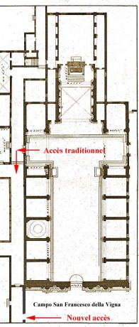 Le couvent de San Francesco della Vigna possède deux cloîtres “visitables“ situés sur la face Nord de l'église : le cloître "au puits" et le cloître "aux cyprès". L'accès se faisait traditionnellement par le transept gauche comme encore indiqué dans la basilique. Lors de la dernière visite l'accès avait été reporté sur le Campo.
