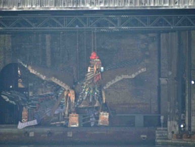 Nous nous sommes longtemps demandé les raisons de la forme particulière de ce bâtiment, jusqu'à la découverte de ce dessin sur internet...Ce système pour poser les mâts à fonctionné jusqu'à la réalisation de la grue à vapeur sur l'autre rive.