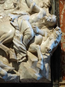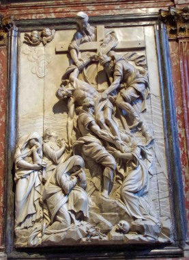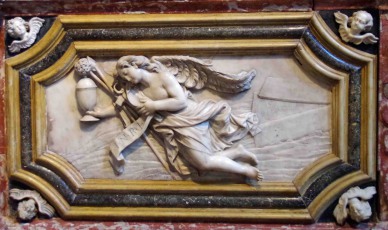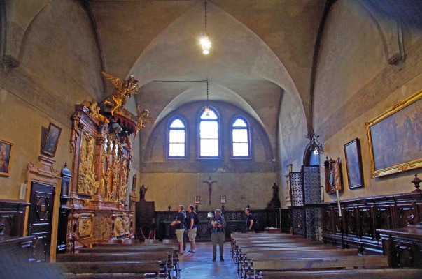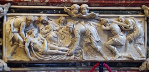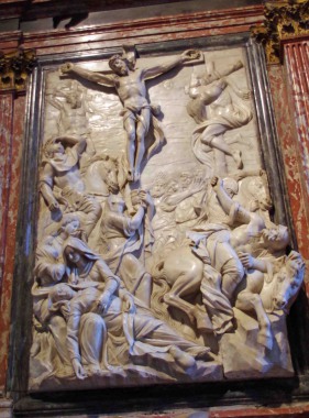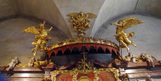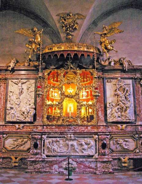 Face à l'entrée, l'autel des reliques, riche autel baroque.