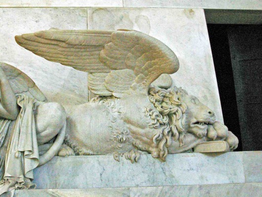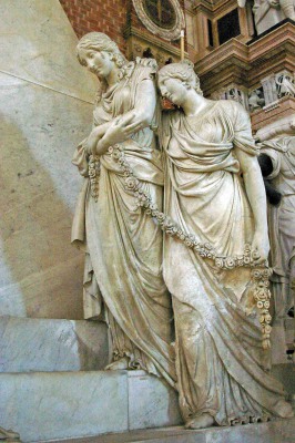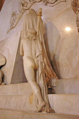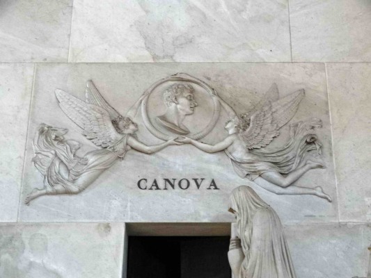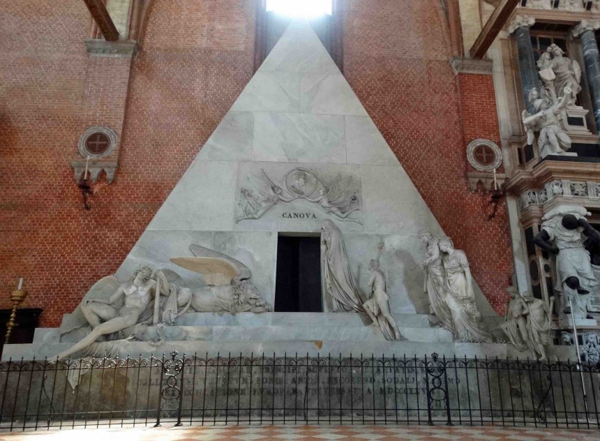 Le tombeau fut dessiné par Canova en 1794 pour le tombeau du Titien mais ne fut pas réalisé. Antonio Canova né le 1er novembre 1757 à Possagno (Province de Trévise), est mort le 13 octobre 1822 à Venise. Ses disciples reprirent le dessin pour son tombeau.