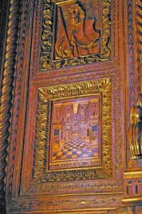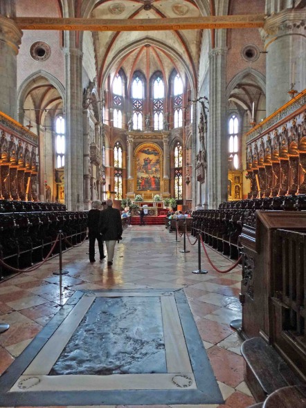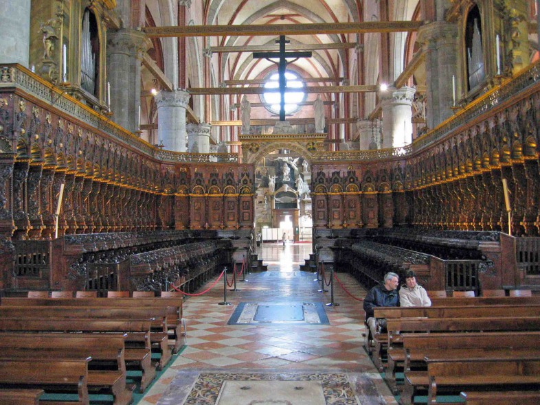 Derrière cette clôture de pierre, se trouvent les 124 stalles échelonnées sur trois étages terminées par Francesco et Marco Cozzi en 1468.