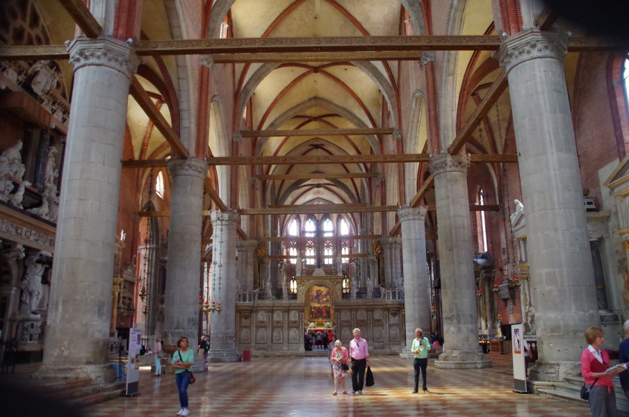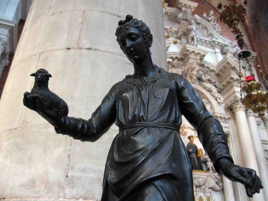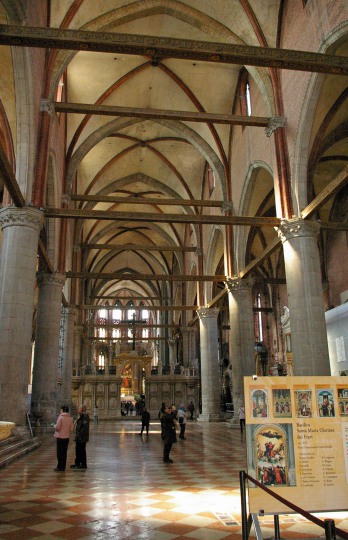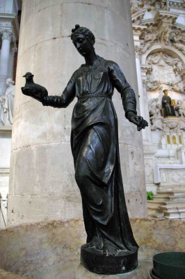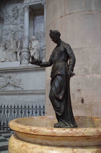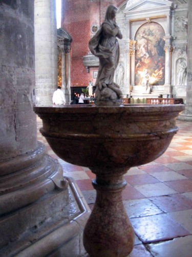 Nef voûtée avec huit colonnes. Seul élément intéressant trois bénitiers surmontés d'une statue.