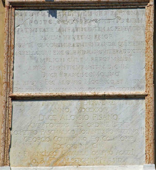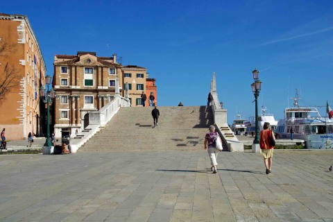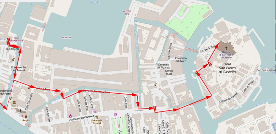 Au milieu de l'allée menant à l'église, une pierre blanche à mi-chemin entre le parvis de l'église (qui était alors la Cathédrale de Venise) et le bord du Canal de San Pietro indique l'endroit où le patriarche de Venise accueillait le Doge en visite.