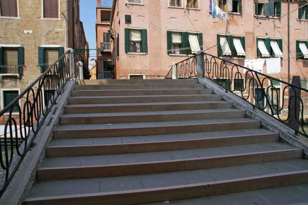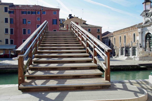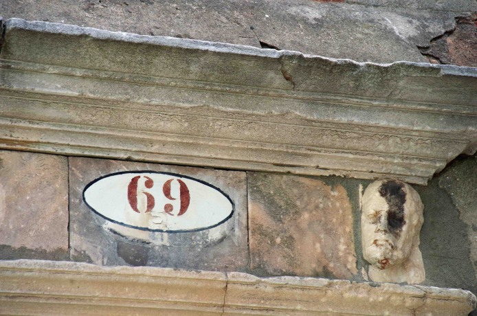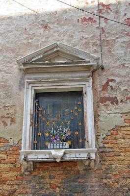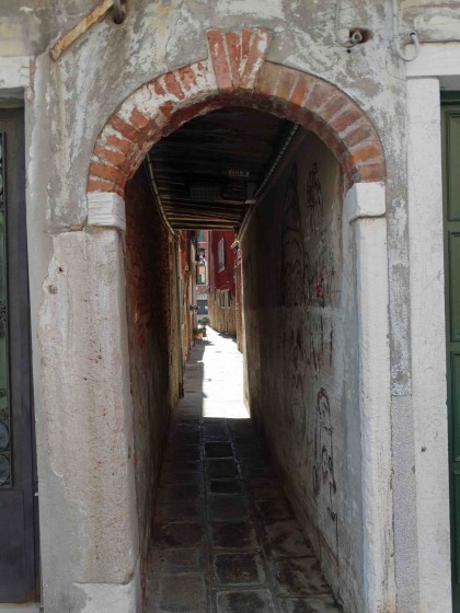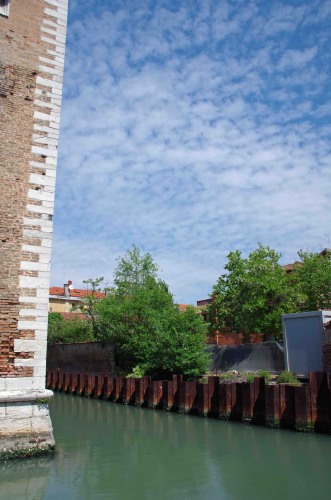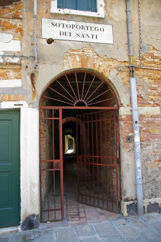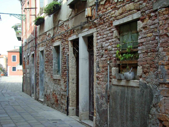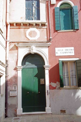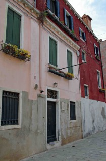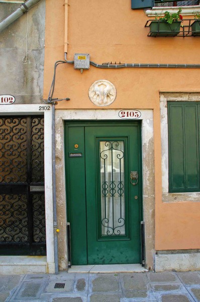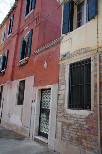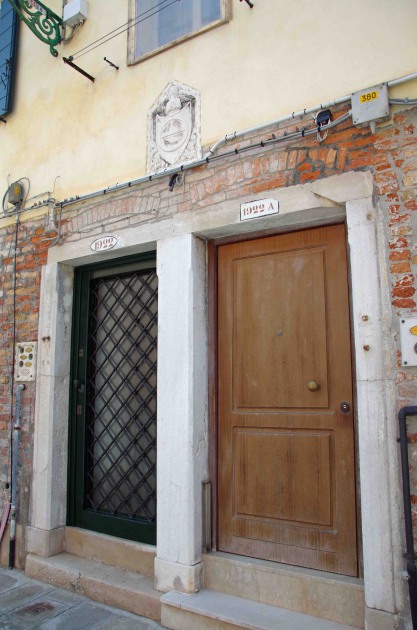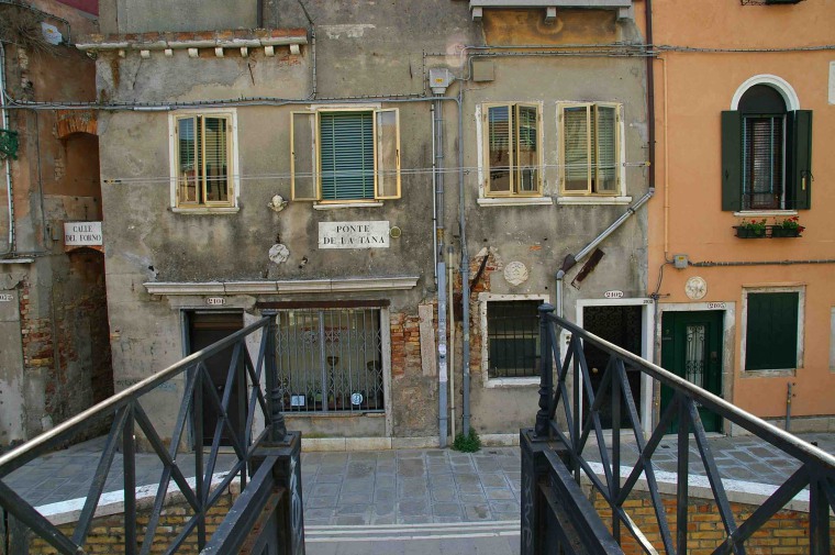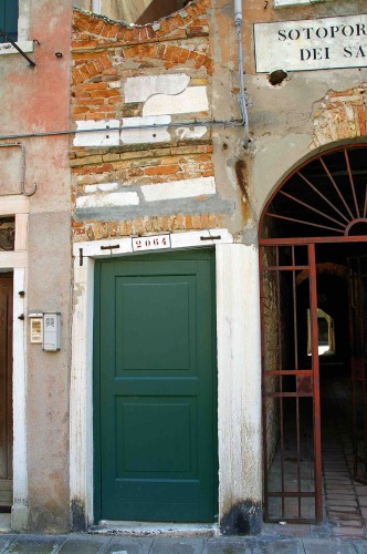 Face au Pont, sur le Fondamenta de la Tana que nous prenons sur notre gauche, deux maisons contigües sont décorées des traditionnelles patères vénitiennes. Un peu plus loin, au 2064, une porte nous prouve que le sol vénitien est de nature instable...