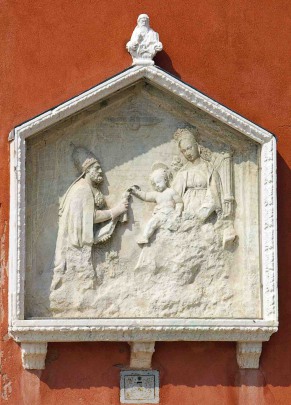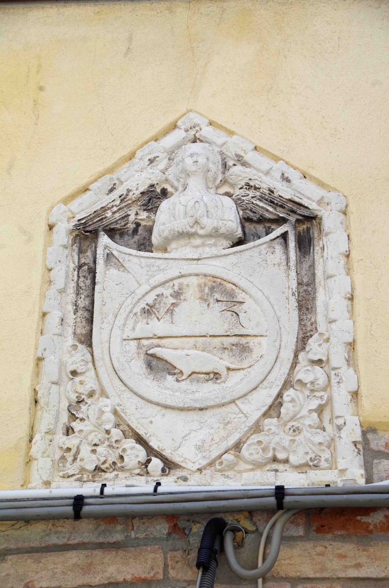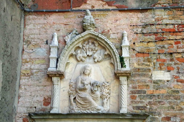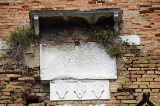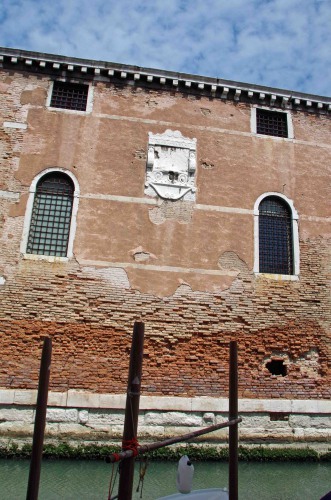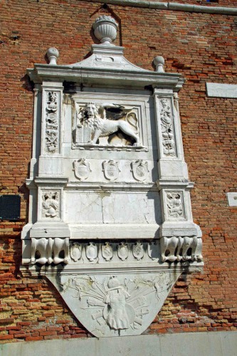 En continuant sur le Fondamenta, nous découvrons au 2028 une “Vierge à l'enfant“ et en face, sur le mur de l'Arsenal, une plaque avec des blasons nobiliaires