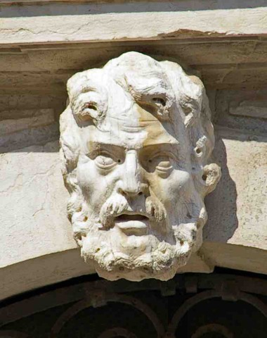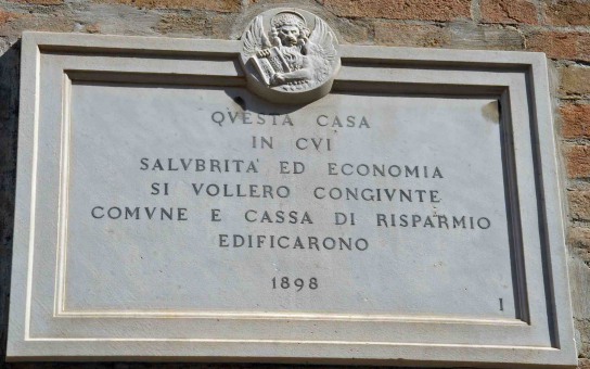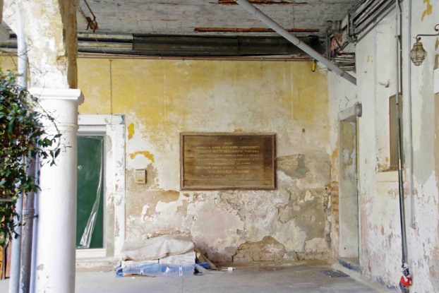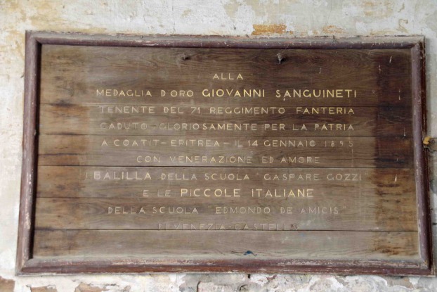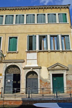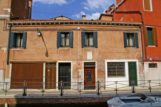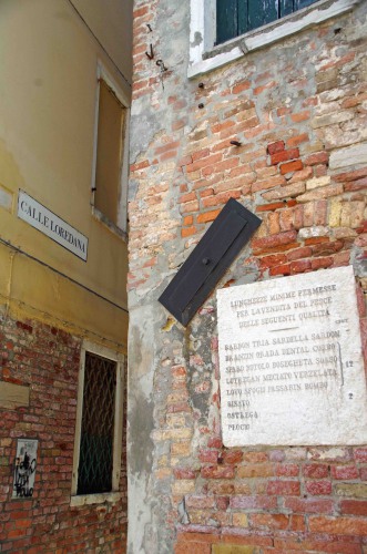 Sur le Fondamenta, face à la patère, notre habitude de regarder en l'air nous fit observer cette plaque commémorative, et sur le mur d'en face un capitello.