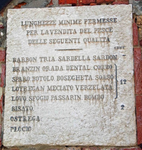 La promenade se poursuit sur le Fondamenta jusqu'à son extrémité présentant, comme à d'autres endroits de Venise, une plaque précisant la taille réglementaire pour la vente des poissons.