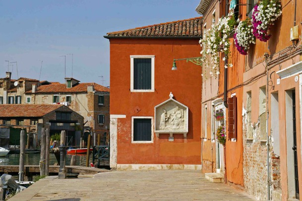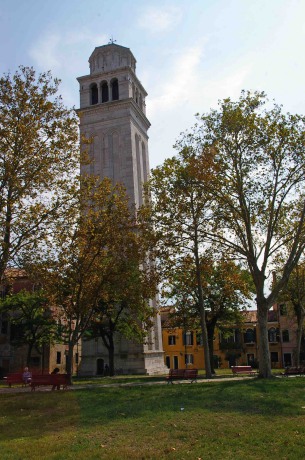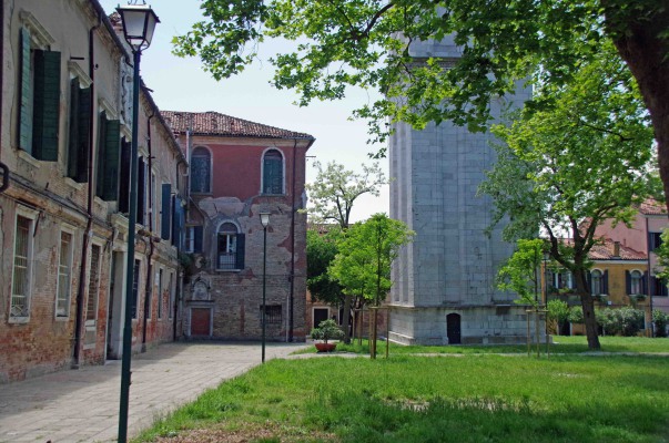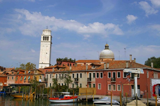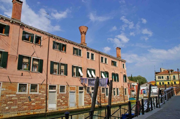 Nous arrivons au bord du Canal de San Pietro et apercevons le Campanile en pierre d'Istrie et la coupole de san Pietro. Une cheminée typique marque la fin du Canal de Santa Anna.