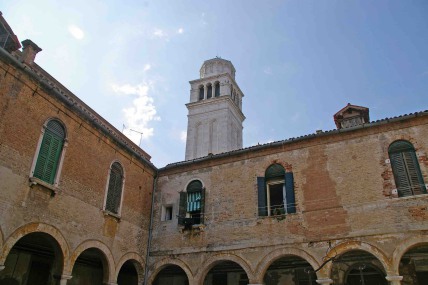 Un dernier changement de direction vers la gauche et nous voila sur le Campo San Pietro où se dresse le Campanile en pierre d'Istrie de 1488, l'église San Pietro de 1596, le Palais Episcopal et son cloître.