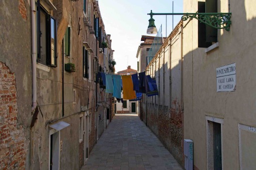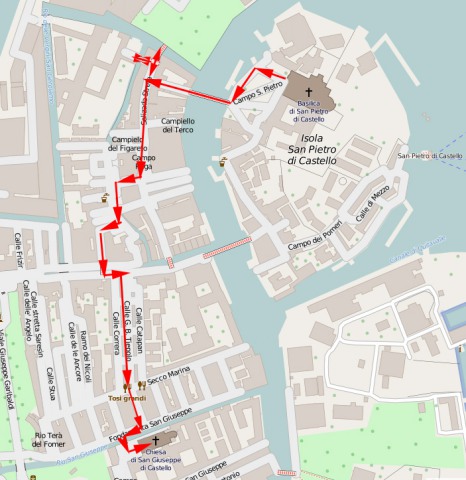 Nous quittons le fondamenta sur notre droite, traversons le Campiello Corner, empruntons la Calle Tiepolo puis presque dans son prolongement le Corte del Magazen qui débouche sur le Fondamenta Sant' Isepo. Nous apercevons sur notre droite le Ponte Sant' Isepo, nous traversons le Rio et arrivons devant l'église San Giuseppe di Castello (vulgo Sant' Isepo), but de notre promenade.
