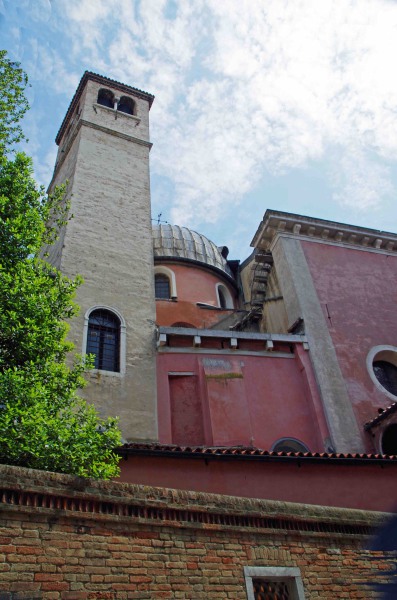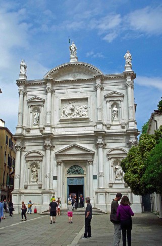 La façade a été érigée en 1765-1771 par Giorgio Fossati et Bernardino Maccaruzzi en symbiose avec la façade de la Scuola. Les statues flanquant la porte sont de Giovanni Marchiori ainsi que les statues intérieures de David et Sainte Cécile.