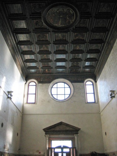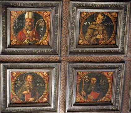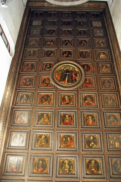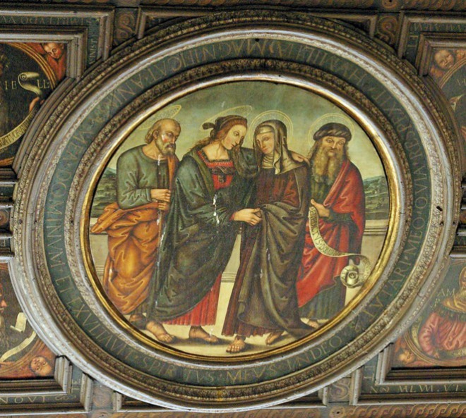 La partie la plus importante et la plus précieuse de l’église est le plafond qui contient 58 caissons de 1,30 mètre de côté, avec des portraits de saints de l’Ancien et du Nouveau Testament et un rond central (diamètre de 2,50 mètres) illustrant la rencontre entre la jeune Vierge Marie et sa cousine Elizabeth. Les peintures datent du début du XVIe siècle et sont l'œuvre de Pietro Paolo Agabiti (ou Agapiti, vers 1470 - 1539) et de son atelier qui a opéré dans lesMarches et enToscane.