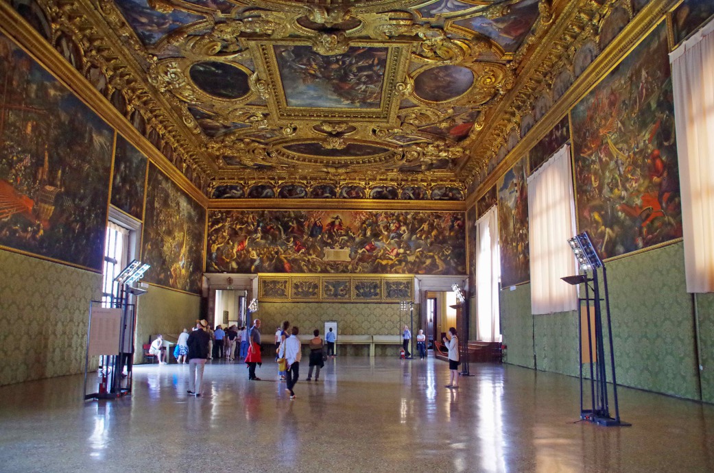 Cette salle est une copie en réduction de la Salle du Grand Conseil : plafond somptueux, portraits des doges, grandes toiles aux murs. Elle donne à l'Ouest sur la Piazzetta et à l'Est sur le Cortile du Palais.
