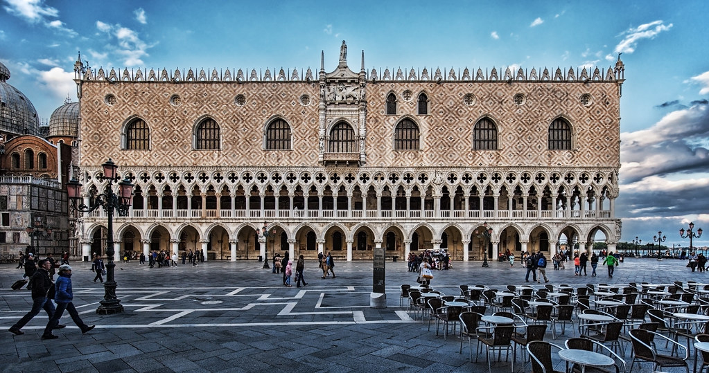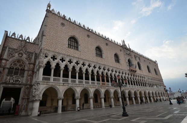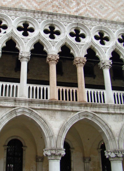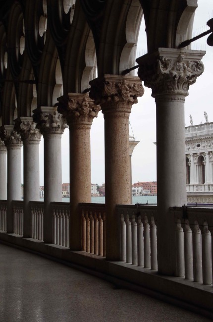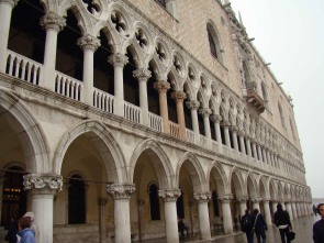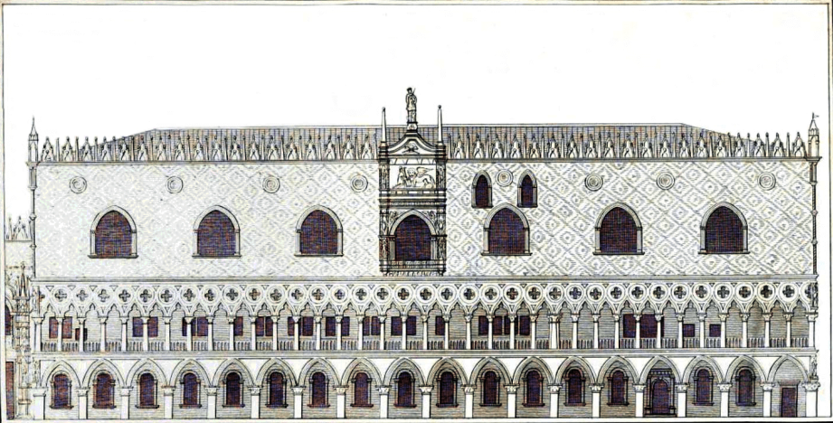 Cette façade, longue de 75 mètres, portée par 19 colonnes fut construite en deux fois. La première partie (jusqu'à la 6e colonne en partant de la lagune) fut construite de 1400 à 1410 en mème temps que la façade sud. Le reste, jusqu'à la basilique fut érigée plus tardivement.