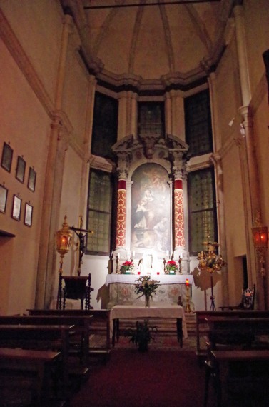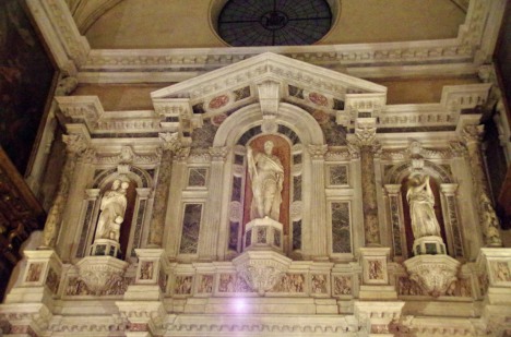 Nous ne pouvons pas, hélas, vous présenter une visite complète de l'église. Nous n'avons pu la visiter que vers 17h45, et un 31 Décembre, à Venise il fait nuit depuis un certain temps. Il fallait donc forcer sur les réglages de sensibilité, d'autant plus que tous les autels n'étaient pas éclairés...Ils l'ont été en partie un peu plus tard mais pas dans l'ordre de notre visite si bien que nous avons fait des va-et-vient sans logique et l'emplacement des oeuvres n'a pas été bien notés. Et enfin, pour couronner le tout nous n'avons pus nous approcher du choeur, qui était en pleine préparation pour une cérémonie. Voici toutefois quelques éléments présentables... Mais comptez sur nous... Nous reviendrons!