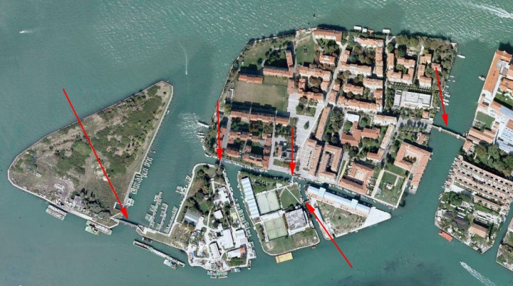 5 ponts ont été identifiés sur les îles constituant Sacca Fisola et Sacca San Biagio dont un commun avec l'île de la Giudecca :