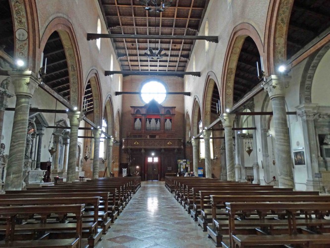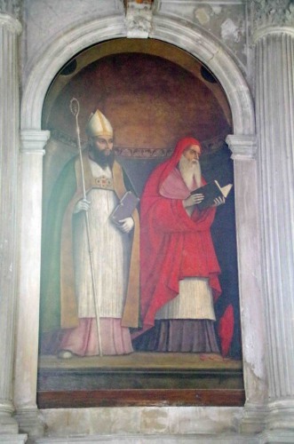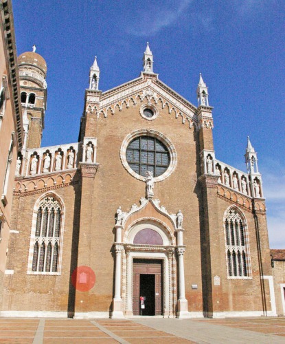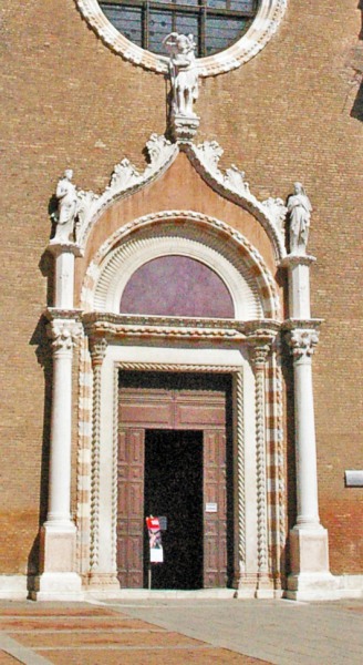La façade et le cloître datent de 1460-1464. Les douze apôtres dans les niches de la façade seraient suivant les sources, de la famille Dalla Masegne ou de maîtres toscans; le saint Christophe au dessus du portail est de Matteo Raverti et l'Annonciation d'Antonio Rizzo.