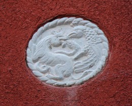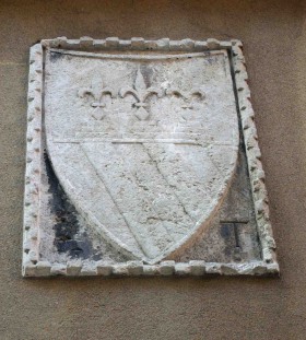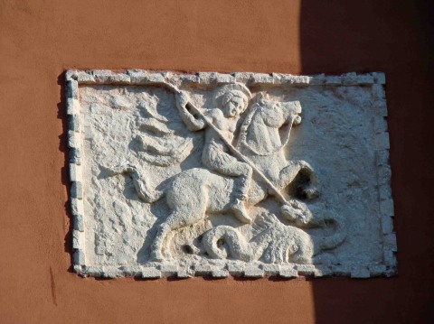 Au 239 entre deux fenêtres de l'Hôtel Gardena, nous pouvons apercevoir l'une des nombreuses patères représentant Saint Georges terrassant le dragon.
