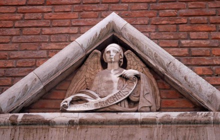 L'inscription est tenue par deux femmes dont l'une tient une équerre et l'autre une clepsidre.