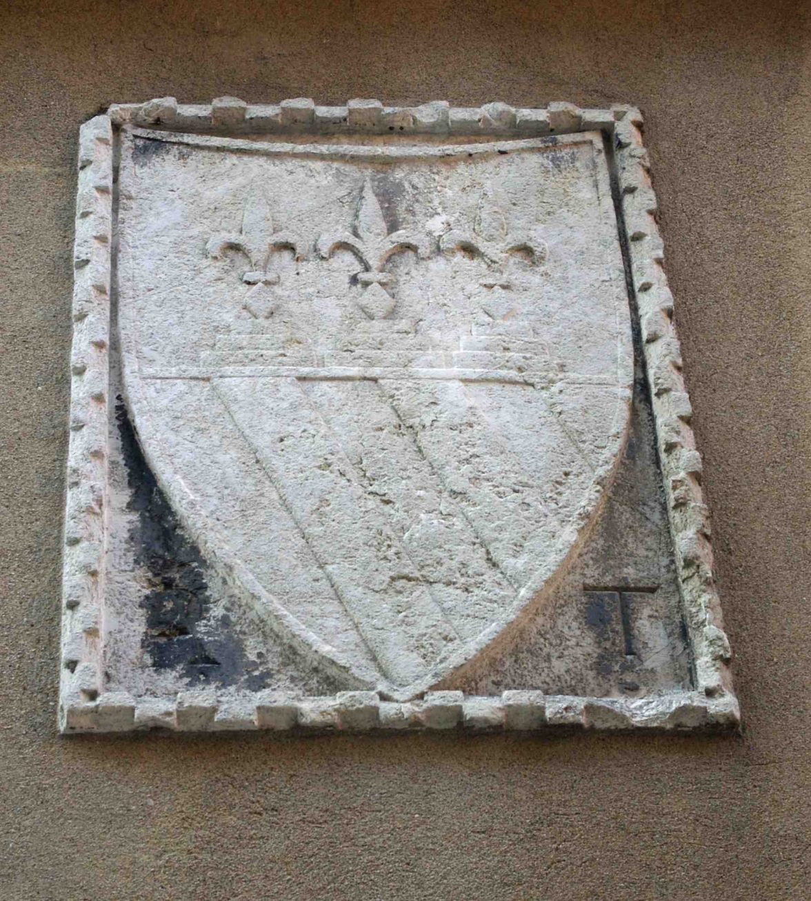L'inscription est tenu par Simon et Judas : Simon tient un blason où l'on voit un oiseau au milieu d'une bande et Judas porte une petite niche vide.