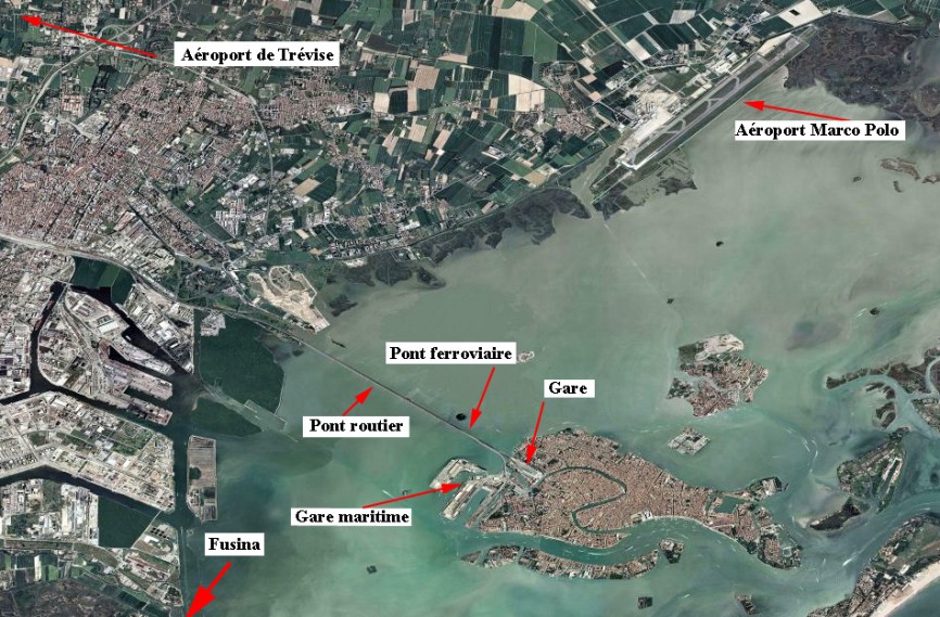 Il n'est pas question de détailler tous les façons d'accéder à Venise (1), mais simplement d'illustrer ces moyens de transports.