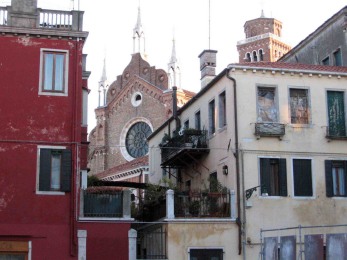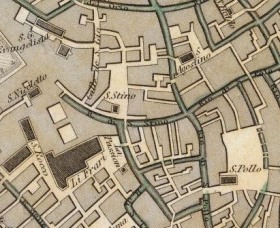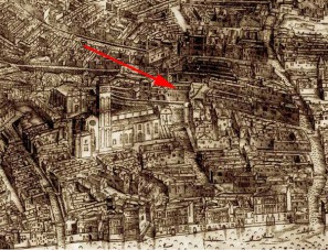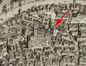 Le campanile qui figure sur le plan Barbari est érigé près du choeur de l'église à 3 nefs.