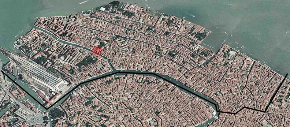 La façade sur le Fondamenta de Cannaregio est dissymétrique, mais cette dissymétrie n'est pas d'origine. L'extension est facilement détectable en observant les corbeaux sous le toit au dessus des deux fenêtres de droite.