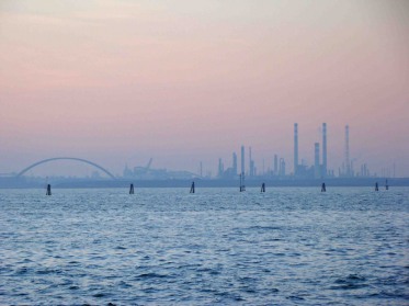 En arrivant à la pointe de l'île, on découvre le port et la zone industrielle de Marghera.