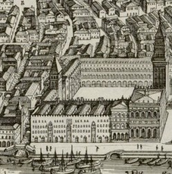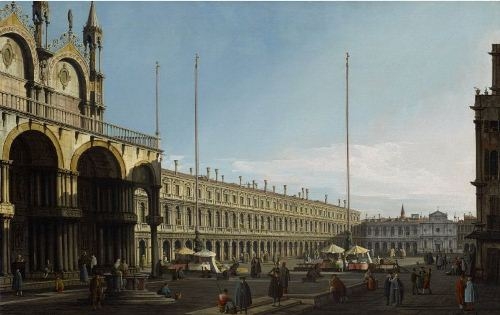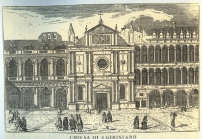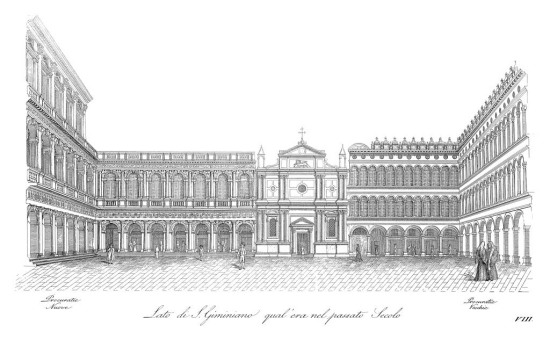 Au fond de la place est le petit portail de l’église de San Giminiano , revêtu de beaux marbres et de bonne architecture ; il a deux ordres de colonnes, qui en soutiennent un troisième, moins large que les deux premiers, et qui portent un fronton accompagné de deux petits campaniles. On voit dans cette église plusieurs bons tableaux de l’Ecole de Venise et un beau plafond. C’est là qu’est le tombeau du célèbre Sansovin, peintre, sculpteur et architecte, et qui a si longtemps exercé ses talents à Venise et qui a décoré cette église, tant à l’intérieur qu’à l’extérieur. Au-dessus de l’épitaphe est son portrait peint par lui-même. Vis-à-vis est la sépulture de François Sansovin, son fils, auteur assez connu et souvent cité, surtout par rapport à son ouvrage de l’origine des maisons illustres de l’Italie.