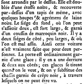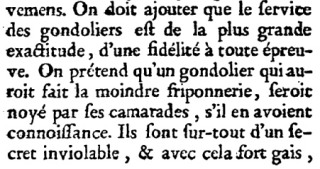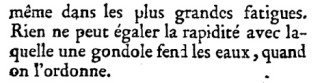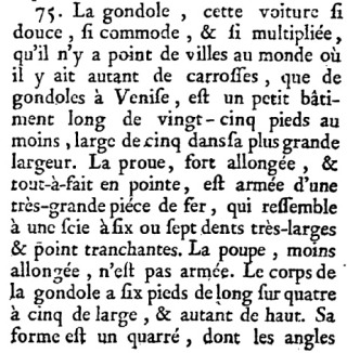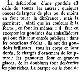 Voila ce qu'en disait le Président de Brosses le 13 août 1739 : (1) C'est un bateau long et étroit comme un poisson, à peu près comme un requin : au milieu est posée une espèce de caisse de carrosse, basse, faite en berlingot(2), et du double plus long qu'un vis-à-vis(3); il n'y a qu'une portière dans le devant par où l'on rentre <.......>. Le bec d'avant de la gondole est armé d'un grand fer en col de grue garni de six larges dents de fer. Il sert à la tenir en équilibre, et je le compare à la gueule ouverte du requin<........>Tout le bateau est peint en noir et verni, la caisse doublée de de velours noir......