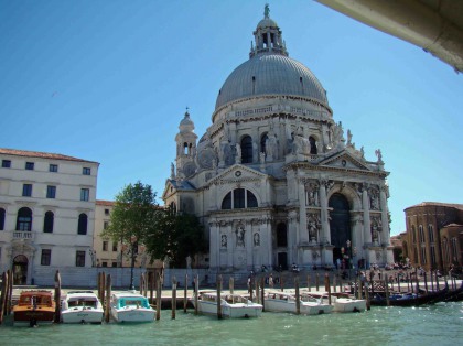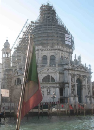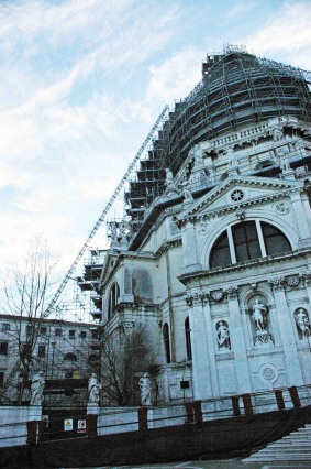 Sa construction fut décidée par le Sénat de Venise en 1630, alors qu'une épidémie de peste commencée dans l'été 1630 avait décimé près d'un tiers de la population en deux ans. A l'emplacement choisi s'élevaient l'église et le monastère de Santa Trinita qui furent détruits. La construction commença en 1631 et le monument fut inauguré en 1681. Cependant, la construction ne s'acheva qu'en 1687, 5 ans après la mort de l'architecte, Baldassare Longhena. Il y aura consacré 50 années de sa vie. Cette construction repose sur plus de un million de pilotis. Les tours, qui se dressent de chaque coté du choeur, contribuent à s'opposer aux poussées des coupoles. L'une d'entre elle sert de clocher.