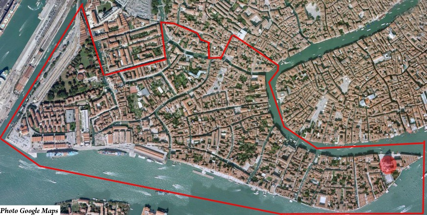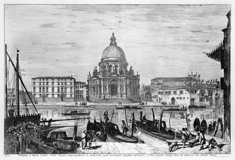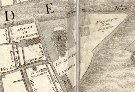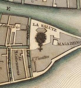 Compte-tenu des dates de construction, on ne trouve évidemment pas de représentation de la Salute sur les plans Barbari et Merian.
