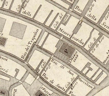 Il est à noter que sur ce plan, le Rio noté comme del Trapolin est maintenant le Rio del Grimani et celui noté San Marcilian est maintenant le Rio dei Trapolin.