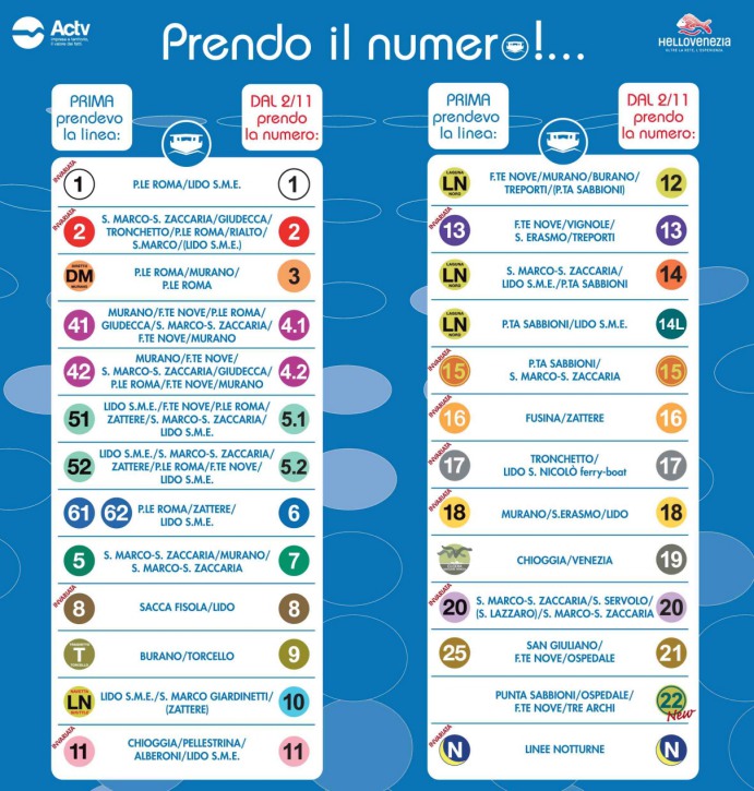 Vaporetti : Terme utilisé de manière générique par les touristes, mais qui correspond à une catégorie bien spécifique de bateaux. Numérotation des lignes de l'Actv.