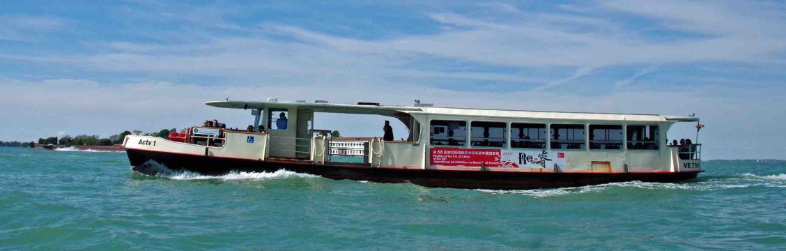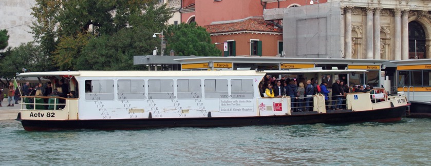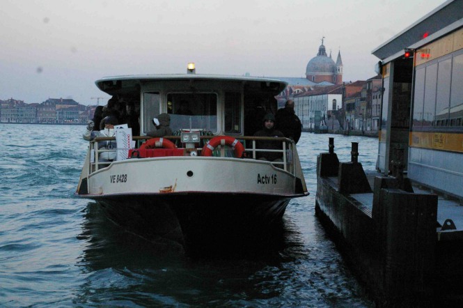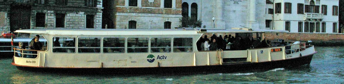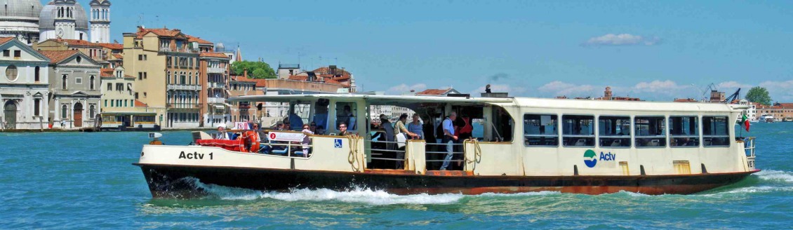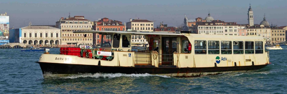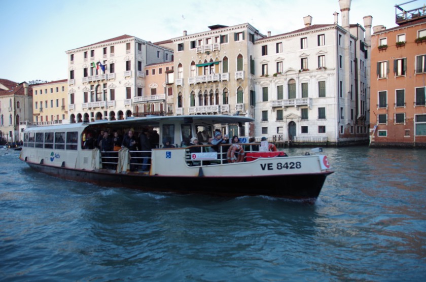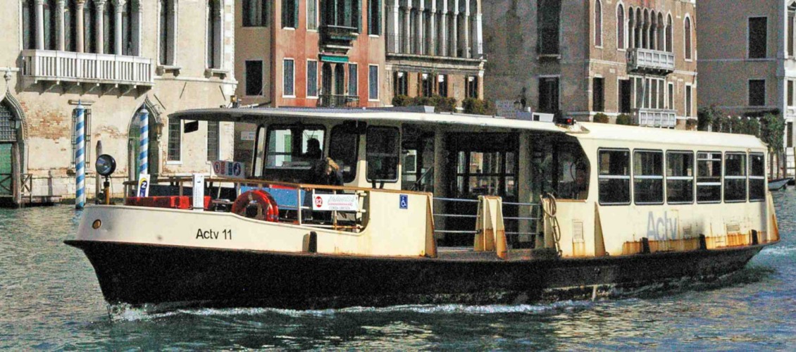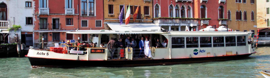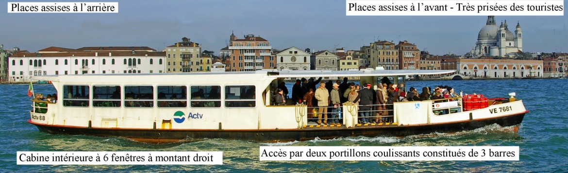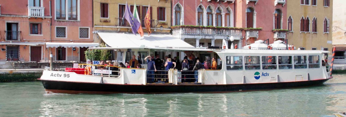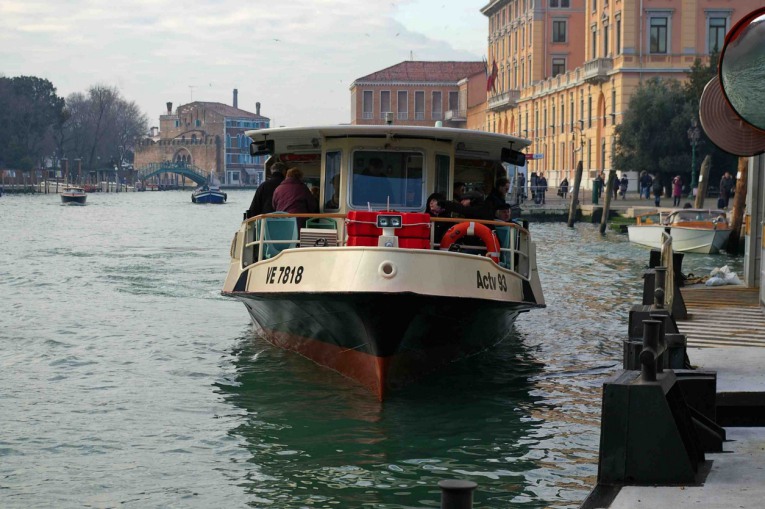 Afin de distinguer à l'approche les lignes desservies par les Vaporetto, ceux ci portent maintenant l'avant un 1 ou un 2 blanc dans un fond rouge . Photo 29/12/2017 - Canal Grande