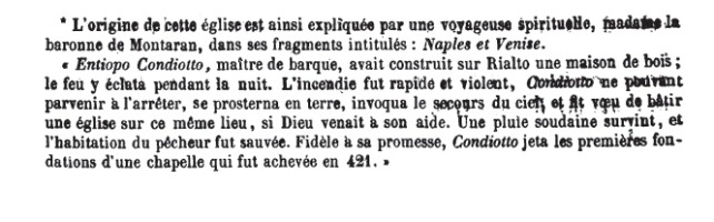 La tradition voudrait qu'elle soit la plus ancienne église de Venise. Le début de sa construction daterait du 25 mars 421 jour dédié à la fête de l'Annonciation qui marquait, à l'époque, le début de l'année pour les Vénitiens. Toujours selon la légende elle aurait été érigée par un charpentier qui avait voulu vouer cet édifice à San Giacomo, suite à un incendie.(1) D'études récentes il semblerait que l’édifice initial est en fait plus tardif. La première date qui fait une référence sûre remonte à mai 1152, où elle est citée. En 1513, elle échappe, avec quelques dégâts, au grand incendie qui dévaste la zone commerciale voisine.