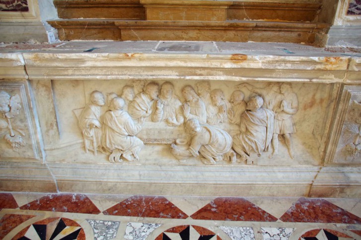 Bas-relief : Vierge à l'enfant entourée de Saint Pierre et saint Paul