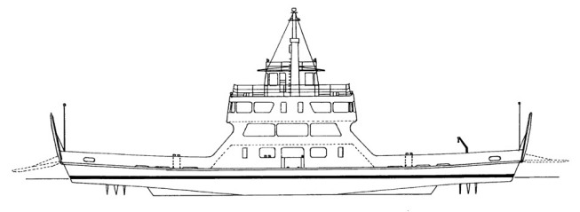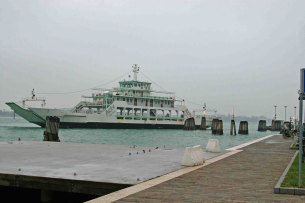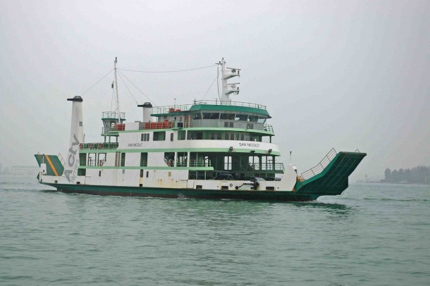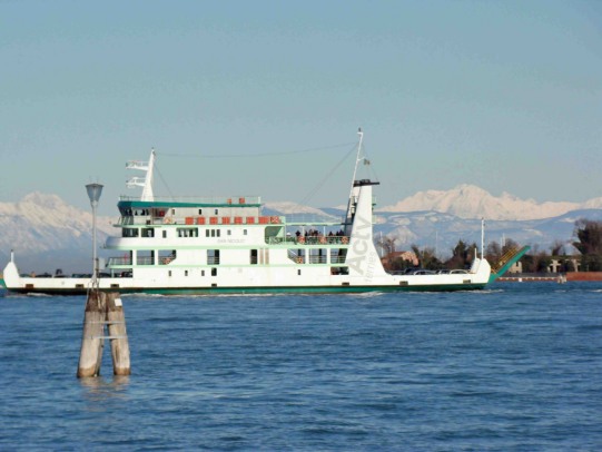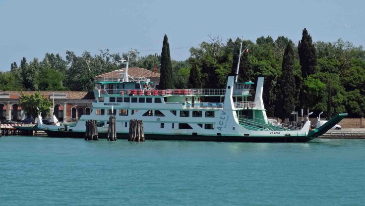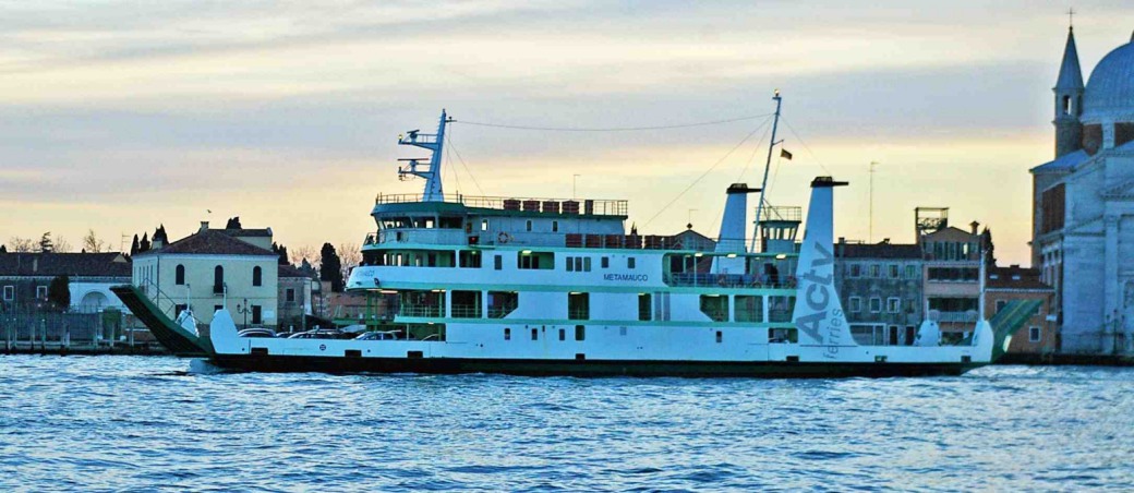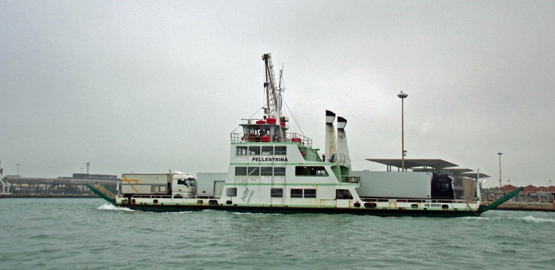 Navire embarquant cars, camions, voitures, il circule entre Venise et le Lido, le Lido et Palestrina.