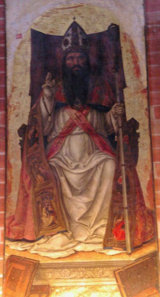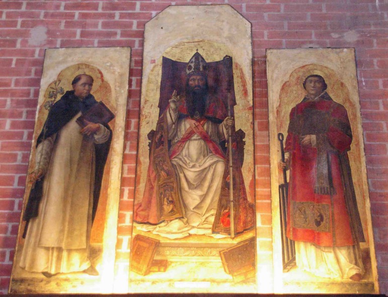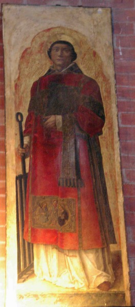 Ce grand polyptyque contenait dix panneaux dans trois niveaux. Saint Augustin (191 x 69) est signé et daté 1473. Il au centre du niveau principal, où il était entre les panneaux de Saint Marc et Saint Jean le Baptiste. Les panneaux légèrement plus petits ( 158 x 56) de Saint Dominique et le Saint Laurent appartenaient au deuxième niveau, où ils entouraient une Vierge à l'enfant. Le troisième niveau contenait quatre médaillons de saints. Le polyptyque a été démembré au dix-neuvième siècle.