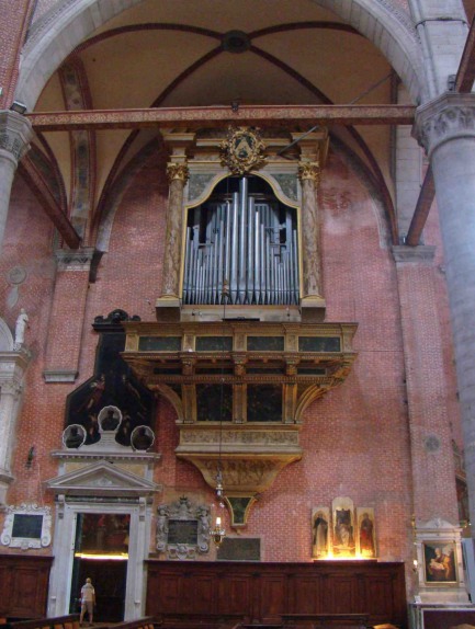 Suspendue, dans l’espace de la première arcade, la tribune de l’orgue, du célèbre Gaetano Calido, (18è siècle)