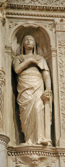 Au tympan de l’arc, Vierge assise, Saint Marc qui lui présente le doge, et Saint Théodore. Les quatre statues représentent les vertus cardinales;
