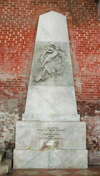 En1842 ils firent part de cette décision à Mazzini, et depuis lors ils se tinrent en correspondance continuelle avec lui. Ils réussirent à gagner à leurs idées un autre officier de la marine vénitienne Dominique Moro; ils abandonnèrent les navires autrichiens qu'ils commandaient et allèrent se réfugier à Corfou, attendant que la nouvelle d'un soulèvement en quelque point de l'Italie les appelât à combattre pour la sainte cause. Survient le mouvement de Calabre,à peine né, il fut arrêté. Mais des fausses nouvelles jointes à Corfou firent croire que l'insurrection se maintenait dans les montagnes. Les frères Bandiera décidèrent alors de se porter au secours des insurgés et d'autres patriotes se joignirent à eux. Au nombre de 19 ils débarquèrent à Cotrone, en Calabre et se dirigèrent vers Cosenza. Mais, malheureusement, parmi eux se trouvait un traître. Ils furent bientôt entourés par un grand nombre de soldats bourboniens et après une courte lutte emmenés prisonniers à Cosenza où on les condamna à mort. Neuf d'entre eux furent exécutés, le 25 juillet 1844, dans le vallon de Rovito. Les frères Bandiera, Moro, Ricciotti de Prosinone, Lupatelli de Pérouse, Lugo Venerucci de Forli, Berti de Ravenne Nondi de Modène tombèrent sereinement sous les balles des soldats bourboniens, criant une dernière fois : Vive l'Italie.
