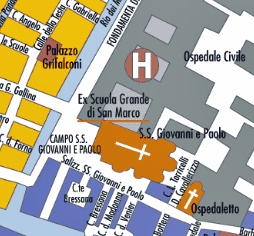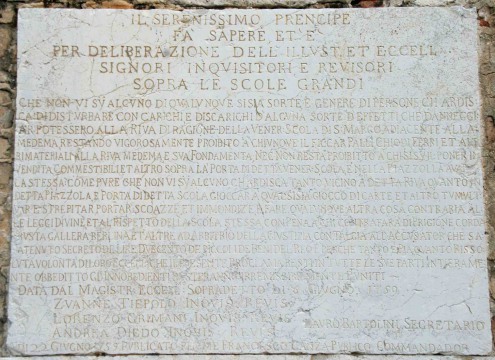 Quasiment à l'angle du Fondamenta dei Mendicanti et du Campo San Zanipolo se trouve une plaque reproduisant un décret des inquisiteurs et réviseurs à propos des Scuole Grandi.