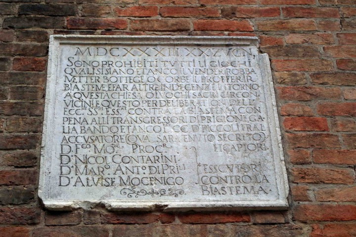 Sont interdits les jeux de toutes sortes ainsi que de vendre des marchandises, d'installer des boutiques ou des étalages, de proférer des blasphèmes ou de se livrer à tout autre indécence, autour de cette église et des ses alentours consacrés; ceci par décision des conseillers, seigneurs et exécuteurs contre le blasphème. Les contrevenants sont passibles de peines d'emprisonnement, de galère, de bannissement ainsi que d'une amende de 200 lires en monnaie (partagées) entre l'accusateur (dont le nom) sera tenu secret et ceux qui l'ont décidé.