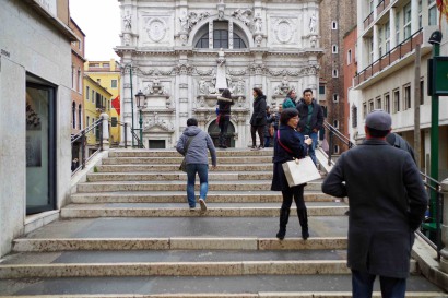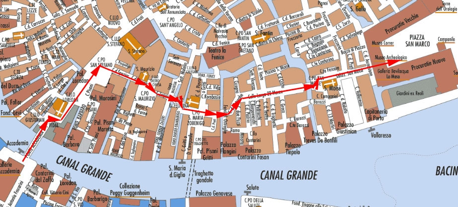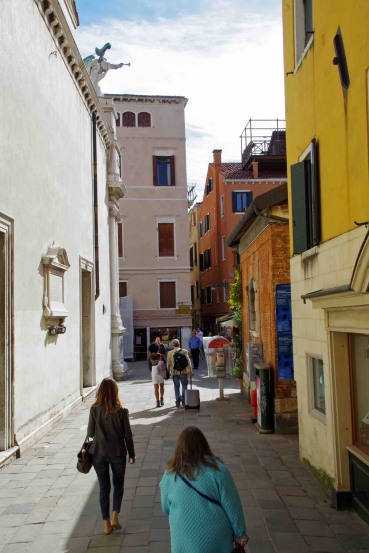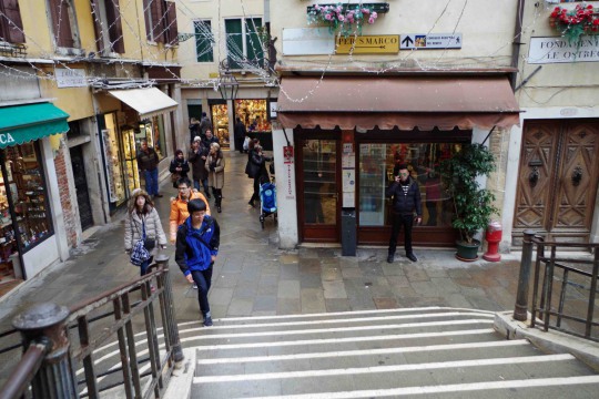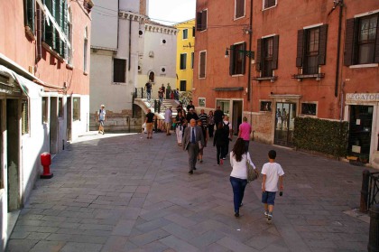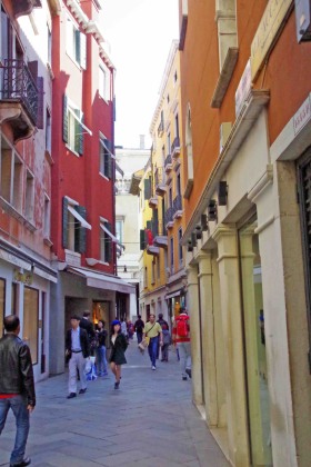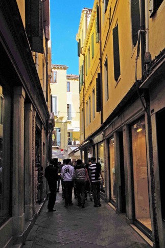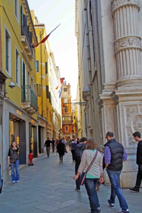 Pour quitter le Campo, c'est facile, il suffit de suivre la foule et les flèches et emprunter la Calle de le Ostreghe, le ponte de le Ostreghe sur le Rio de l'Alboro, un petit détour su le Fondamenta de le Ostreghe et de nouveau la Calle de le Ostreghe pour arriver sur la Calle Larga XXII Marzo (*) non sans avoir fait quelques détours.