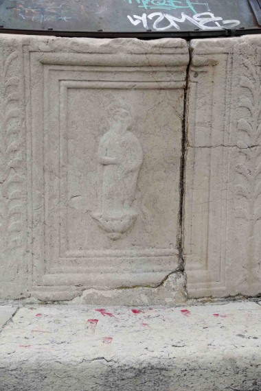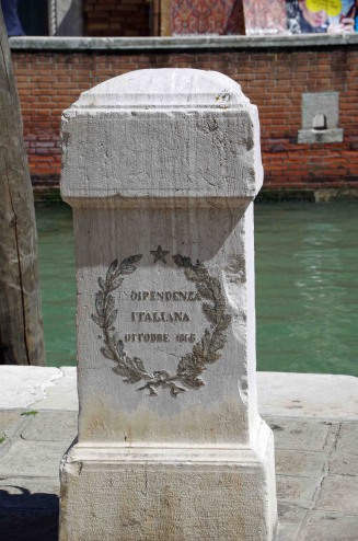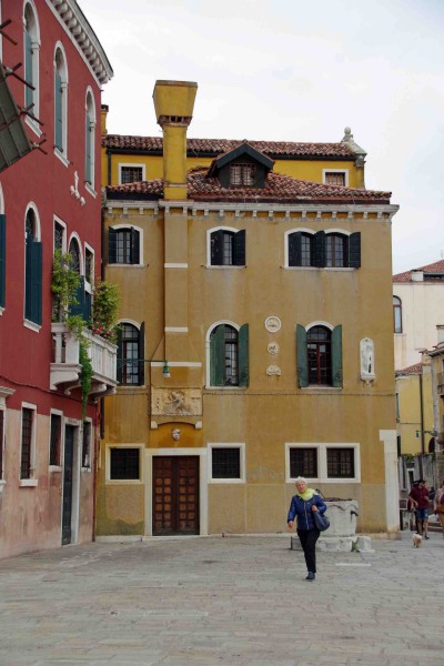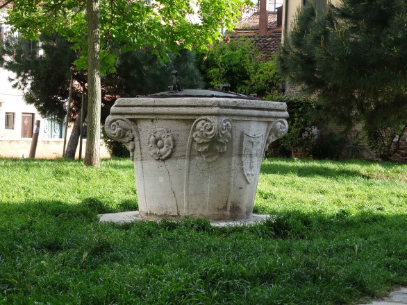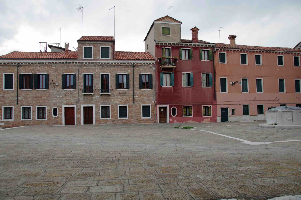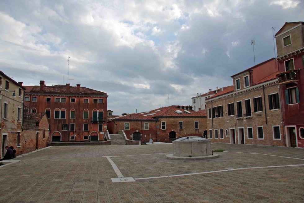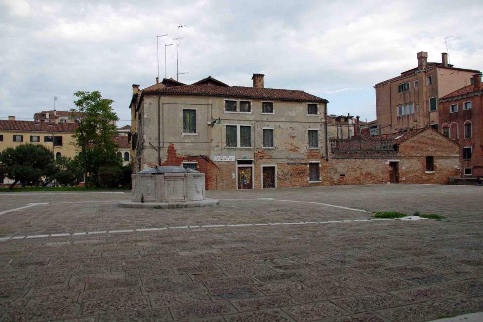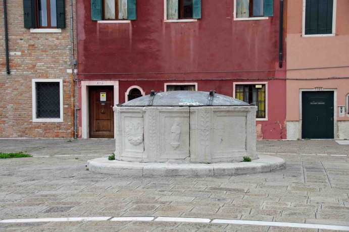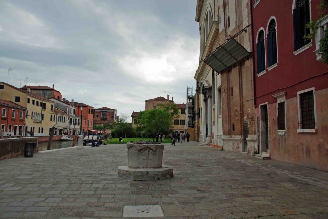 A gauche, Rio de San Trovaso et cippo, au centre un des deux puits de cette partie et à droite église et campanile