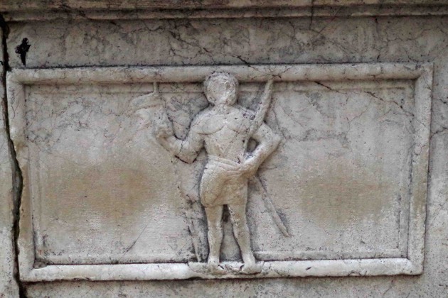 2 - Le palais a été érigé entre les XIV ème et XV ème siècles par la volonté de la famille Pasqualini , originaire de Milan, qui fit fortune avec le commerce de la soie. Ceci est attesté par les armoiries de Pasqualini encore visibles au-dessus de la façade, qui porte la lettre P avec trois barres soumises.